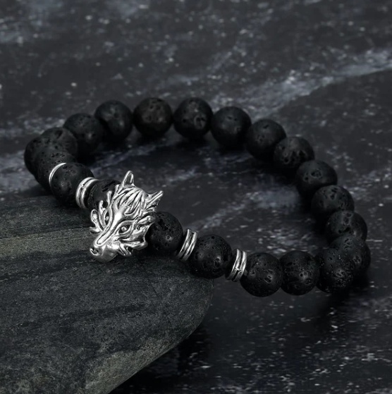 Asgard Crafted Grey Wolf Head And Lava Stone Bracelet